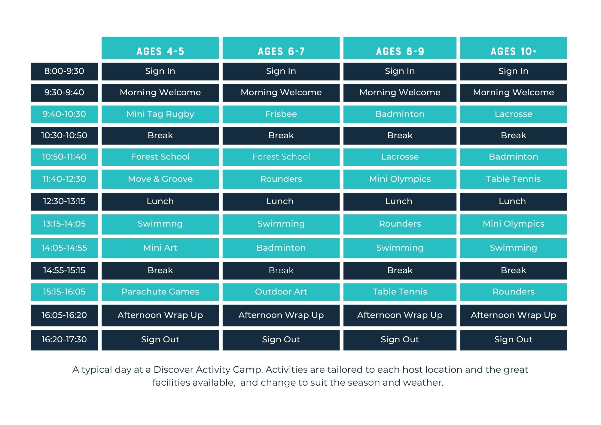 Discover Activity Camps provide inspiring holiday activity programmes designed with physical activity, fun entertainment and personal development in mind. Set in beautiful, safe surroundings, with outstanding sports facilities, stunning grounds and access to specialist classrooms and equipment, the enthusiastic Discover Activity Camps team provide outstanding levels of care every school holiday.